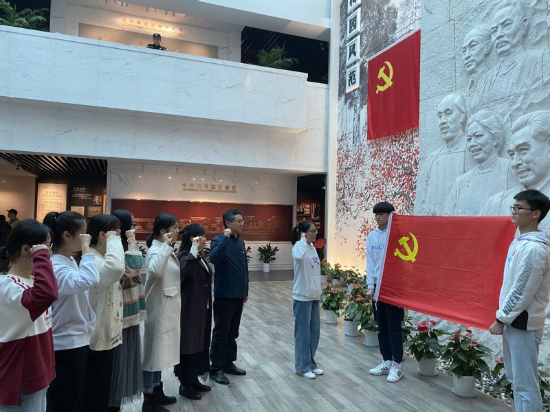 进入梅园新村纪念馆大厅,学生党支部书记李霞妹同志带领全体党员面向鲜红的党旗,举起右拳,重温入党誓词。鲜红的党旗、庄严的誓词震撼现场每一名党员的心扉,坚定了大家不忘初心、牢记使命的政治信念。宣誓仪式结束后,全体党员参观了梅园新村纪念馆有关史料展览。1946年5月至1947年3月,周恩来同志率中共代表团在这里进行了10个月零4天的谈判。在一幅幅图片前、在一件件文物前,全体党员认真观看,深切缅怀周恩来同志为党和人民建立的不朽功勋。深刻感悟他不忘初心、对党忠诚、热爱人民、永远奋斗、勇于担当、鞠躬尽瘁、严于律己、清正廉洁的崇高的无产阶级革命家精神。