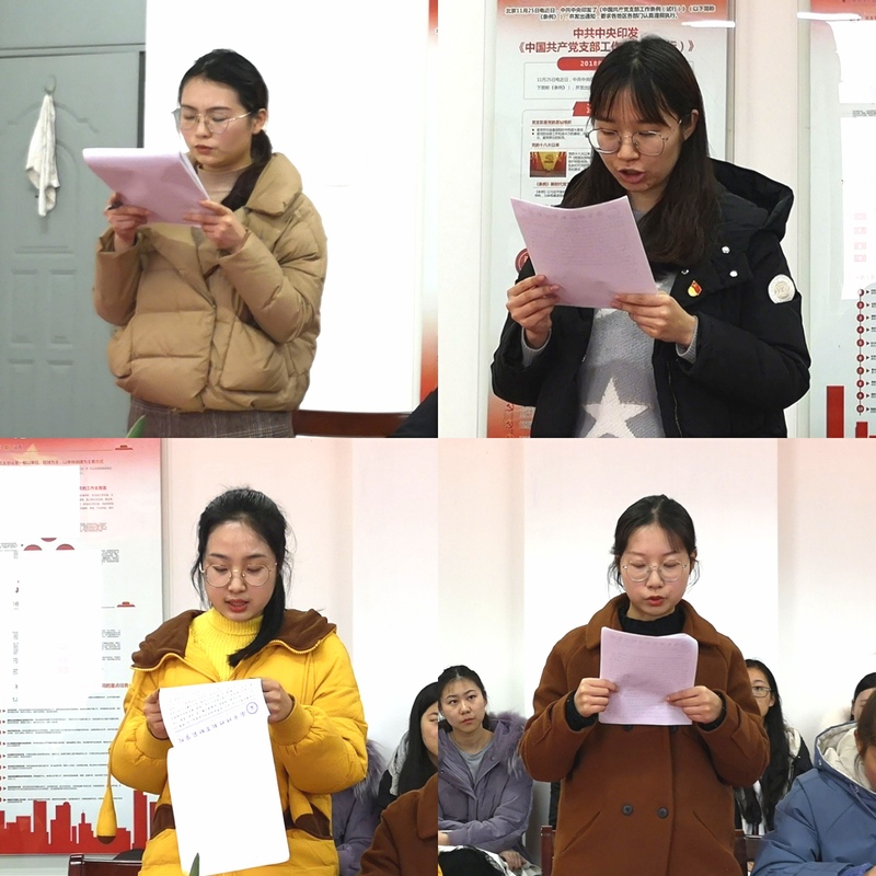 接着,大会严格按照预备党员转正程序对张韵婕等四位预备党员的转正问题进行了逐个讨论,采取无记名投票的方式对他们进行了逐一表决,一致同意张韵婕、马海燕、薛明月、丁璐璐四位同志按期转为中共正式党员。