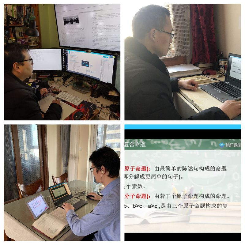 先看看计算机老师的技术范。朱兆松老师的书房简直就是实验室的节奏,多屏幕的切换,配置了手写板,这些都为“线上教学”提供了便利。装备的多样、先进极大保障了线上教学的有序性和趣味性,但是朱老师仍然觉得压力比较大,对他来说这是一次挑战。朱老师说:线上教学的实时性,意味着课前准备要更加充分、材料要更加丰富与多样化,对老师来说是磨炼;平台具有回放功能,学生能够复习,老师也能复课,可以不断挖掘自己教学过程中的问题,进一步提高教学水平和质量;但线上教学互动环节不够直接,相比线下教学效率稍低。