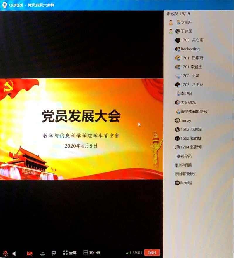 48日下午3点,伟德官网学生党支部利用线上直播的方式顺利召开学生党员发展大会。支部全体党员、六名发展对象以及入党介绍人张胜伟、李明扬、颜无瑕三位老师一同参加了大会。会议由学生党支部书记李霞妹老师主持。