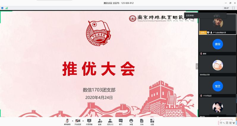 推优大会开始,先由各班团支书介绍《南京特殊教育师范学院“推优”工作制度》中的“推荐对象和推荐条件”“推优工作的程序”等内容,随后各推优对象依次向团支部推优大会汇报了个人的基本情况、入党动机、本人学习和工作情况及其他需要向团组织说明的问题,值得一提的是本次推优发展工作十分注重在疫情防控志愿服务中发现和考验团员青年,对于表现突出、符合条件的及时推荐。大会严格按照“推优”程序,充分发扬民主精神,全体团员本着认真积极的态度充分发表意见。所有候选人汇报完毕后,各班团支书在班级QQ群发起匿名“云”投票,在班级同学都无异议后确定本支部2020年春学期入党积极分子名单。