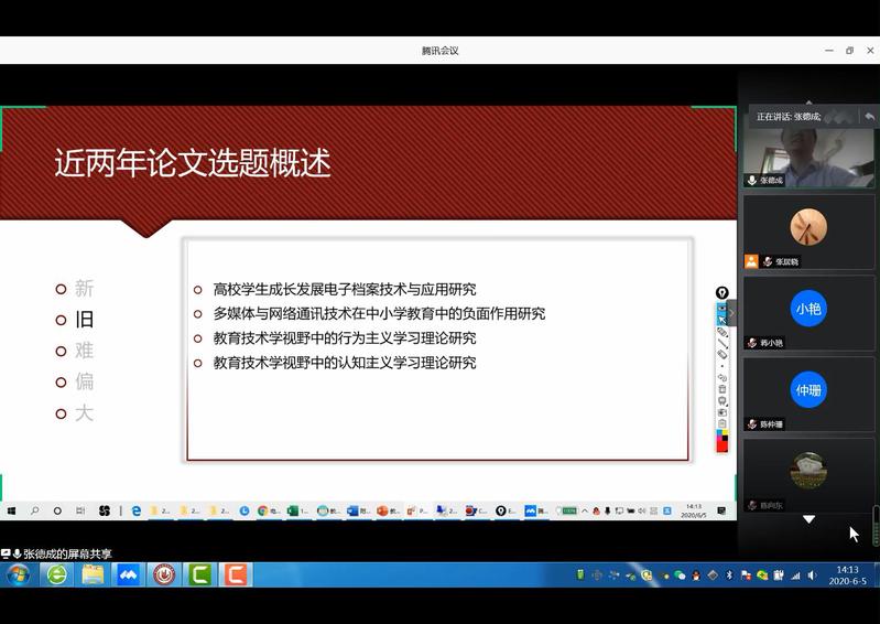 2020年6月5日下午,伟德国际1946源于英国邀请盐城师范学院张德成副教授给教育技术学专业师生开展“教育技术的毕业论文选题遴选”专题讲座。讲座由学院教学副院长张居晓副教授主持,2017级教育技术学专业毕业论文指导老师及学生代表聆听了讲座。
