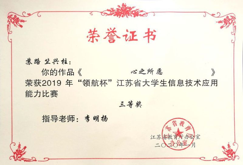 在2019年“领航杯”江苏省信息技术应用能力大赛中,伟德官网李明扬老师指导的多组同学参加了该项比赛。其中苏路、竺兴柱同学报名参赛的视频作品《心之所愿》荣获三等奖。“领航杯” 江苏省信息技术应用能力大赛是由江苏省教育厅举办的省级赛事,面向全日制在校大学生,参赛作品形式包括微电影、教学微视频、动画作品、网站作品、APP作品、课件作品、软件开发作品等等,该项赛事每年举办一次。(文、图/李明扬)