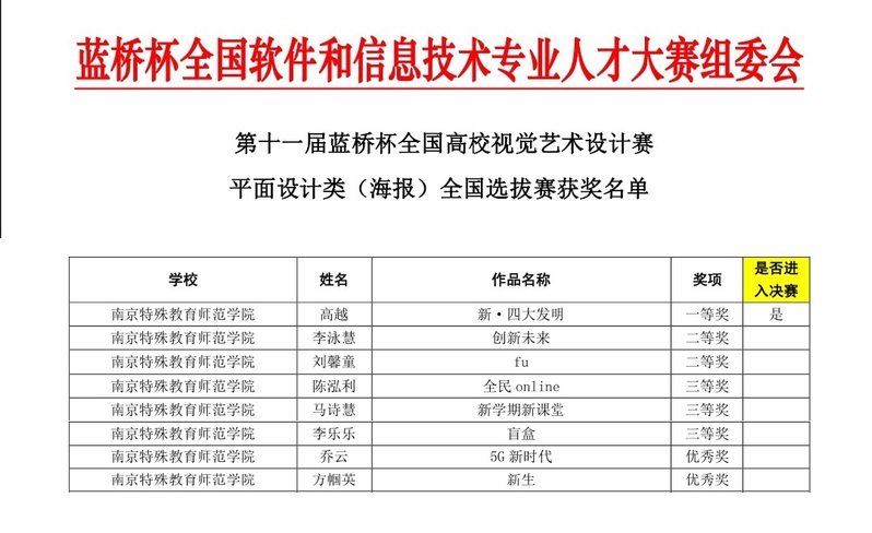 在平面设计类中,由戴玥老师指导的高越同学作品《新·四大发明》获得设计赛总决平面设计(海报)江苏省一等奖;李泳慧同学作品《创新未来》获省二等奖;马诗慧同学作品《新学期新课堂》、李乐乐同学作品《盲盒》获省三等奖。由李明扬老师指导的刘馨童同学作品《fu》获省二等奖;乔云同学作品《5G新时代》获省优秀奖。由许梦阳老师指导的陈泓利同学作品《全民 online》获省三等奖;方帼英同学作品《新生》获省优秀奖。