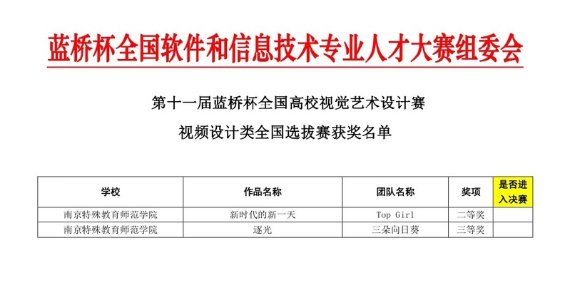 在视频设计类中,由戴玥老师指导的李欣欣、杨嘉缘、李雨晴、徐静四位同学的作品《新时代的新一天》获得视频类江苏省二等奖。由李明扬老师指导指导的彭圣捷、高伟国、俞伽三位同学的作品《新时代的新一天》获得视频类江苏省三等奖。