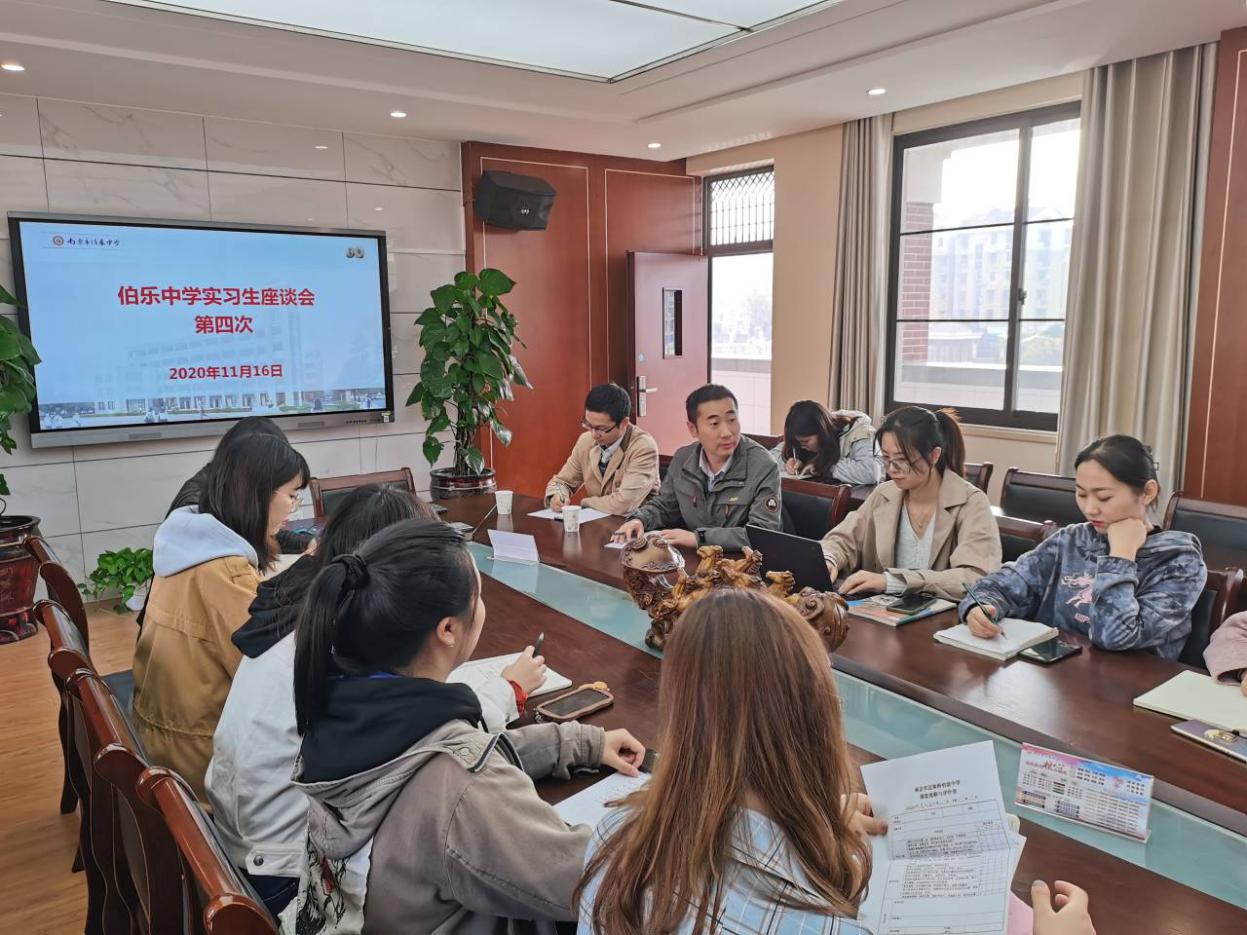 随后,张副院长与实习生召开了实习座谈会。会上,实习生们畅所欲言,纷纷就实习感受、体验与收获以及实习过程中存在的一些问题等向领导和老师做了汇报和反馈。张副院长认真聆听并语重心长地与学生进行交流。最后,张副院长对实习生提出了几点建议和要求,一是要求学生能够平衡学习和工作方面的关系,要做好时间管理;二是要求实习生按照实习手册上的规定较好地完成所有实习工作,如听课、上课、班主任工作等;三是在建议实习生在面临多个方向时,要学会选择,在遇到迷茫困惑时,要学会调解自己的情绪。四是要求实习生在实习结束后要及时回顾、总结,不断完善自我,为真正走上教学岗位打下坚实基础。