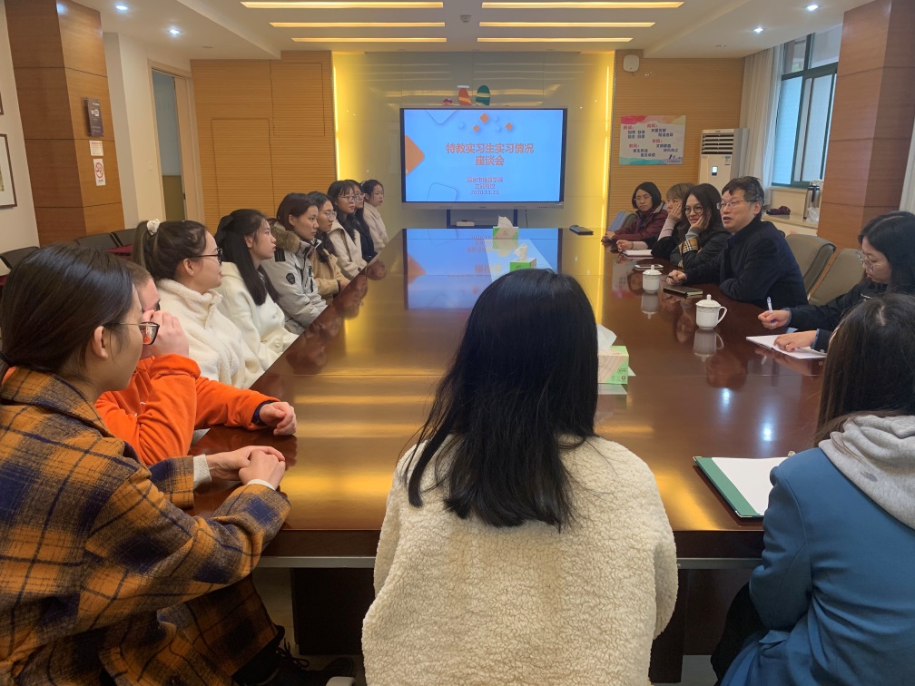 随后与朱校长一起召开了实习生座谈会。胡院长强调实习生要爱岗敬业,秉承学校校训“博爱塑魂”精神,充分发挥伟德官网“三爱”特色,用爱心、耐心呵护特殊教育学校的学生,实习实践中检验所学知识,查漏补缺,提高综合素质,全面发展,为高质量就业打下基础。朱校长赞扬实习生在这一阶段的工作态度和能力,指出特殊教育是一个很有前景和希望的行业,鼓励实习生学好专业学科知识的同时练好基本功,欢迎大家将来投身到特殊教育事业中。