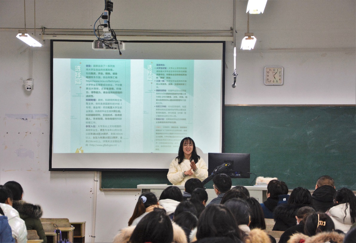 樊琬老师从就业形势与应对策略、未来选择、简历制作与面试技巧、就业信息上报与审核等五个方面进行了宣讲。她强调,毕业生就业是最大的民生,是千家万户的期盼,也是社会和谐稳定的必备条件。今年,在新冠肺炎疫情与百年未有之大变局的叠加冲击下,毕业生就业形势严峻而复杂。同学们应当认识好当前的就业形势,开拓就业渠道设计好的特色简历,训练好的面试技巧,找准好如意东家,昂首阔步奔向就业的战场。坚决向“慢就业”、“懒就业”、甚至“不就业”说不