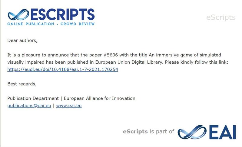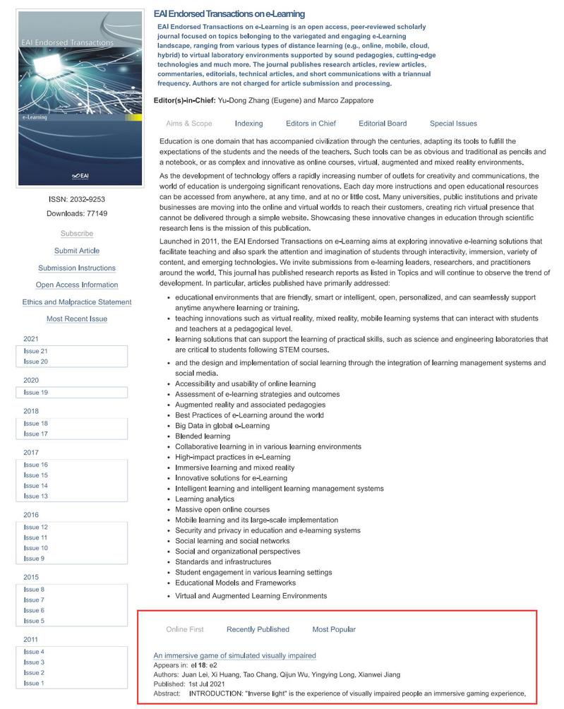 伟德国际1946源于英国1902班雷娟、黄袭、常涛、龙莹莹、吴其俊等同学,结合学科专业,关爱特殊人群,基于Unity3D平台开发了一款沉浸式体验游戏《逆光》,并撰写论文“An immersive game of simulated visually impaired”发表于欧洲学术期刊EAI Endorsed Transactions on e-Learning。
