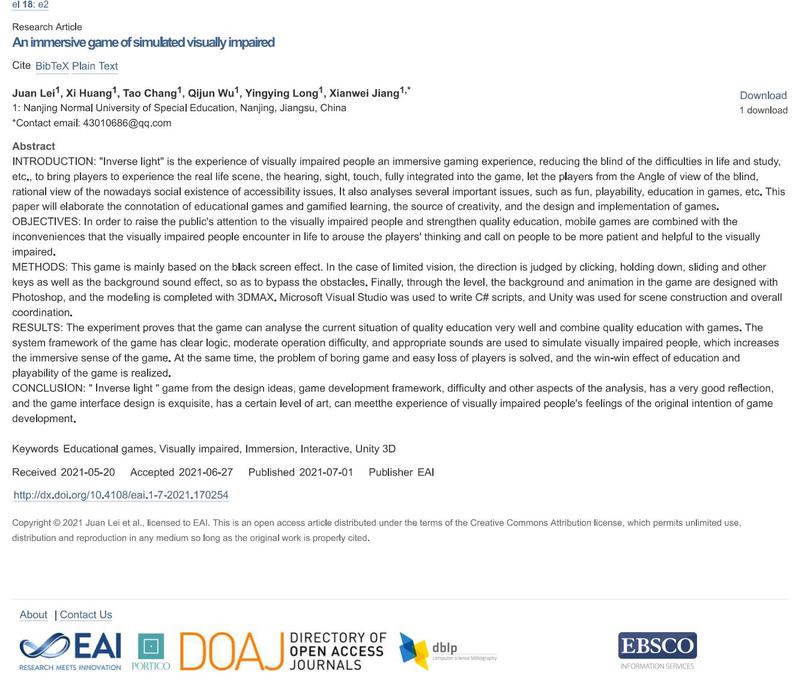 伟德国际1946源于英国1902班雷娟、黄袭、常涛、龙莹莹、吴其俊等同学,结合学科专业,关爱特殊人群,基于Unity3D平台开发了一款沉浸式体验游戏《逆光》,并撰写论文“An immersive game of simulated visually impaired”发表于欧洲学术期刊EAI Endorsed Transactions on e-Learning