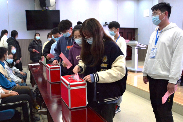 李唐萌老师审议通过关于团、学工作报告的决议。学生代表刘露露同学宣读大会倡议书。在选举计票期间,会场播放了央视频道新闻报道的党的十九届六中全会的相关视频,引导青年学子加强理论学习,坚定政治站位。