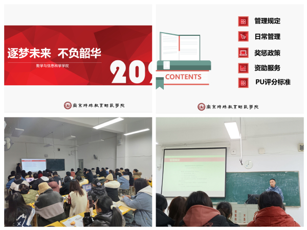 活动中,21级班主任从介绍《学生手册》入手,围绕管理规定、奖罚政策、资助服务等五个方面,带领同学们重点学习了《南京特殊教育师范学院学生学籍管理规定》,并对照十二个章节的具体要求作了详细解读,强调了遵循《学生手册》是教育管理学生,保证学生顺利完成学业的重要依据,每位同学都应该自觉学习并严格遵守。针对学生普遍关心的素质拓展和第二课堂学分认定方面,班主任老师带领大家再次梳理了PU平台的使用和评分标准,使同学们对学分获取途径有了清晰的认识。