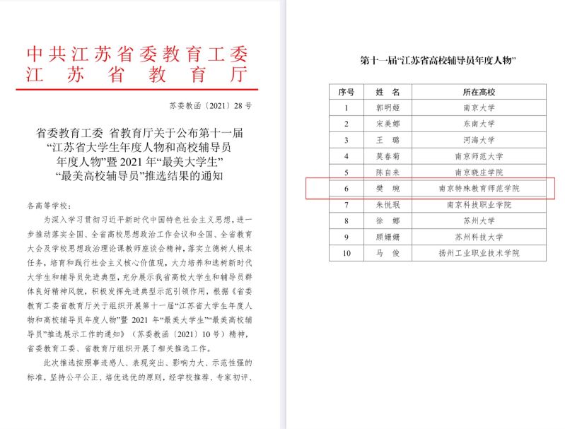 近日,江苏省委教育工委、江苏省教育厅公布了第十一届“江苏省大学生年度人物和高校辅导员年度人物”暨2021年“最美大学生”“最美高校辅导员”推选结果,伟德官网辅导员樊琬老师荣获第十一届“江苏省高校辅导员年度人物”。