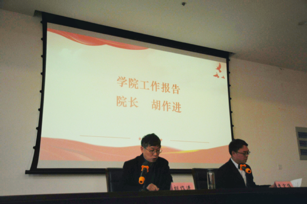 院长胡作进作学院工作报告。他从党建工作、学院治理、人才培养、教学科研等方面回顾了2021年学院建设发展情况及取得的主要成绩,从基层党建、专业建设、校企融合、科教协同等方面展望了2022年工作目标。他表示,2021年,在大家的共同努力下,学院在党建、专业建设、学科发展、学生培养、创新创业、社会服务等方面获得了充足的成效,为学院的“十四五”规划奠定了良好的基础,2022年是学校的本科教学评估年,党的二十大也将于下半年,希望学院全体教职员工要以饱满的热情,勠力同心,再创辉煌,向党的二十大献礼。