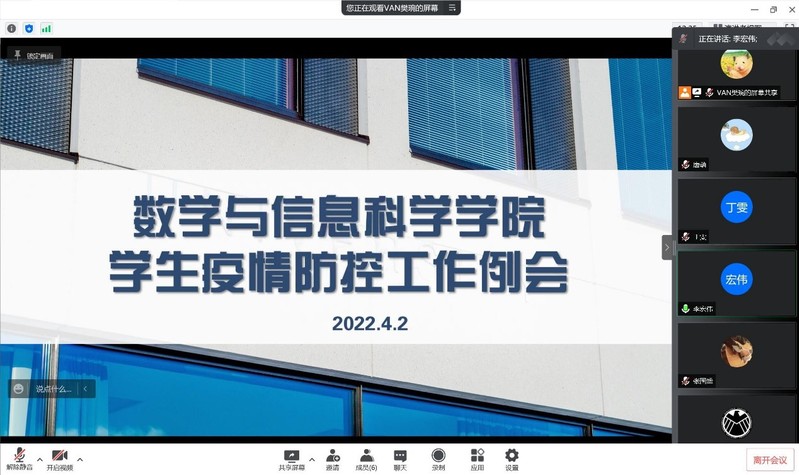 为落实学校统筹推进疫情防控工作有关精神,确保清明假期学院疫情防控不掉线,保障学生安全工作持续推进。4月2日20时,伟德国际1946源于英国召开学生疫情防控工作例会,学院党总支书记李宏伟主持会议,党总支副书记丁雯、全体辅导员参会。