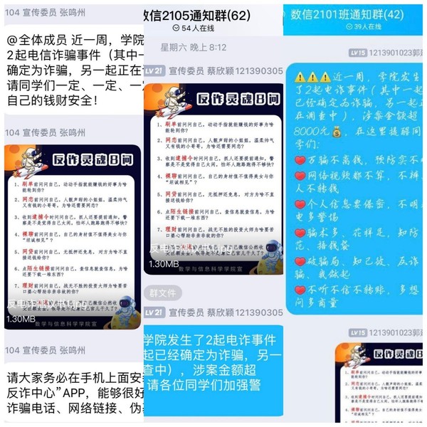 活动初期,学院制作反诈骗宣传海报进行宣传并发布通知,警示同学们加强防范意识,各班级陆陆续续开展为期一周的反诈骗知识问卷调查、线上反诈骗主题宣传教育活动。从什么是电信诈骗、电信诈骗的危害、常见电信诈骗手段、如何识别防范电信诈骗以及上当后的补救措施等方面向同学们普及电信诈骗相关知识,牢筑学生“防诈墙”,守好学生“钱袋子”。同学们纷纷表示只有坚持打防并举、防范为先,才能筑牢防炸反诈的坚实堤坝。