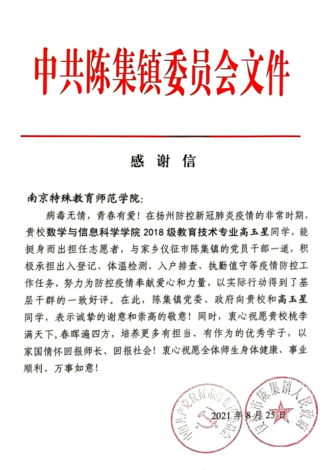 感谢信中写道:病毒无情,青春有爱!在扬州防控新冠肺炎疫情的非常时期,贵校伟德国际1946源于英国2018级教育技术专业高玉星同学,能挺身而出担任志愿者,与家乡仪征市陈集镇的党员干部一道,积极承担出入登记、体温检测、入户排查、执勤值守等疫情防控工作任务,努力为防控疫情奉献爱心和力量,以实际行动得到了基层干群的一致好评。在此,陈集镇党委、政府向贵校和高玉星同学,表示诚挚的谢意和崇高的敬意!同时,衷心祝愿贵校桃李满天下,春晖遍四方,培养更多有担当、有作为的优秀学子,以家国情怀回报师长、回报社会!衷心祝愿全体师生身体健康、事业顺利、万事如意!