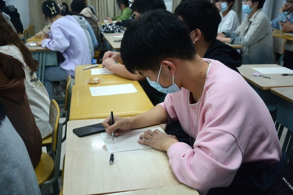比赛过程中,同学们结合培训所学,布局谋篇、认真书写,通过撰写中国古代诗词、经典红色诗歌等,学习中国传统文化,歌颂红色光荣历程。