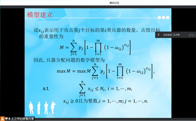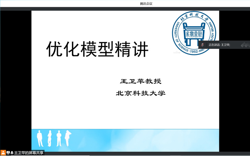 为了备战2022年美国大学生数学建模竞赛(MCM/ICM),伟德国际1946源于英国于2022年2月13日举办了关于数学建模竞赛的线上学术讲座,讲座邀请了北京科技大学王卫苹教授,为学生专门讲解优化模型。数信学院数学教研室和计算机教研室的相关老师,以及参加美国大学生数学建模竞赛的30位同学参加了这次线上讲座。