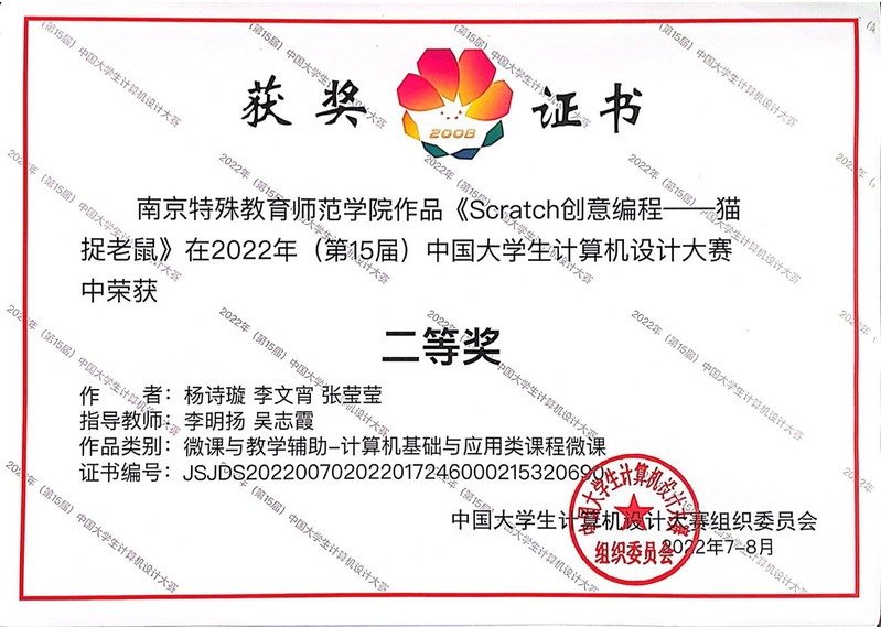 在2022年第15届中国大学生计算机设计大赛中,伟德官网选送的参赛作品《Scratch创意编程——猫捉老鼠》荣获国赛二等奖。