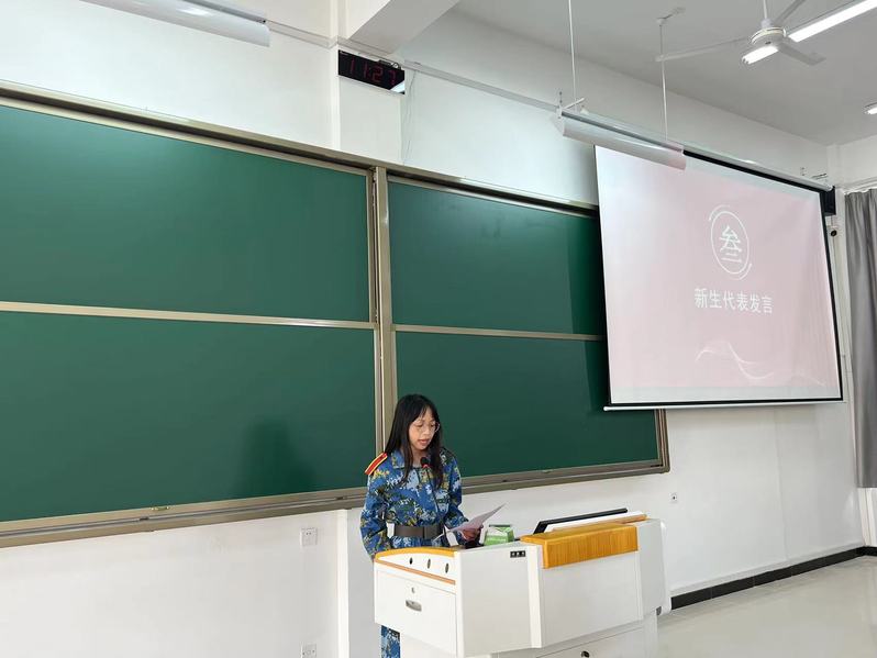数学与应用数学专业2201班陈安竹同学作为新生代表发言,她以自身经历与大家分享了入学感受,表达了对大学美好生活的期望,同时表示将不惧困难挑战,勇担时代使命,拼尽岁月繁华,书写“强国有我”的绚丽诗篇。