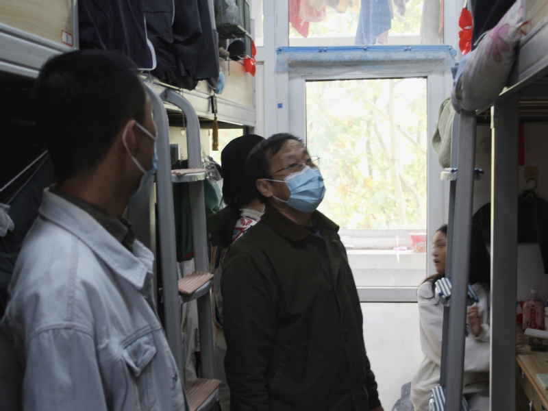 为贯彻落实宿舍疫情防控要求,提高宿舍安全与防范意识,促进学生寝室文明建设,同时了解在校园封控期间学生的生活和学习情况,11月4日下午,伟德国际1946源于英国党总支书记李贵希与辅导员李唐萌、张国盛老师一起看望走访学生宿舍,实地调研学生的思想和学习状况。