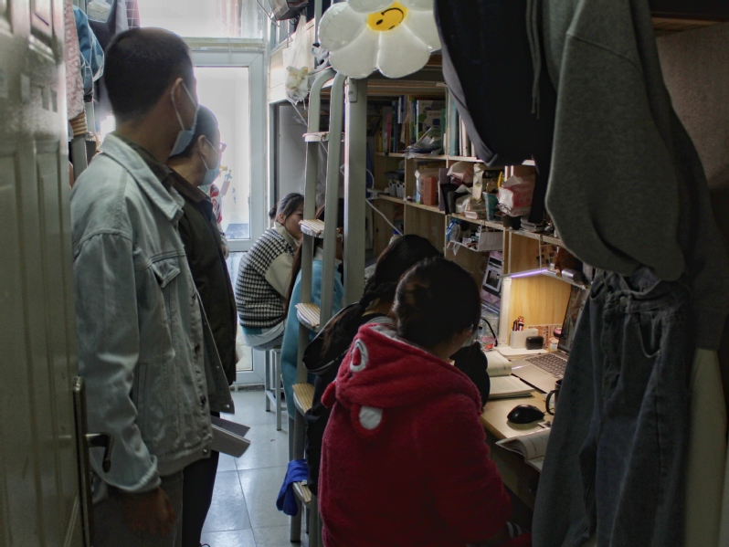 李贵希书记一行走进学生宿舍,针对疫情防控、学生学习情况、生活困扰与同学们进行了耐心的交流解答。走访中,李贵希书记仔细嘱托同学们要注意身体锻炼、加强疾病防御、保持寝室整洁;看到同学们全部端坐在书桌前仔细聆听线上的讲课,认真记笔记时,李贵希书记给予了同学们充分的赞扬。同时,趁课间休息时间,就学习、生活与大家进行了交流,并对准备考研的学生给予了极大的鼓励和自身经验分享。