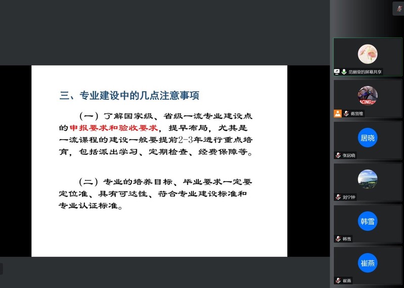 专家发言后,陈向东,刘艳菊,相林,崔燕等教师代表参加了交流和讨论。大家表示通过专家的指导对任务书有了进一步的理解,对实施方案有新的感悟,要发挥个人的基石作用,融入团队,为建设好省一流专业贡献力量。最后,张院长做了会议总结,再次对专家们的指导表示感谢,并号召大家积极投身学院的专业建设,提升自我,成就集体,为学校的高质量发展添砖加瓦。(文、图/蒋贤维 编辑/凌小艳 审核/陈仲珊)