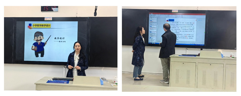 本组陈友朋、刁春好、葛志利、韩艳等老师组成。刁春好老师上课内容是《小学课程教学与课程论(1)》的小学数学教学设计。刁老师首先用5-10分钟的时间对上次课程(理论课)的内容进行回顾和反思,之后围绕问题“从几个方面分析教材?”进行了课堂讨论,学生答题后,刁老师对该问题进行总结。理论内容的复习和讨论后,针对几个不同的主题,学生分组讨论。