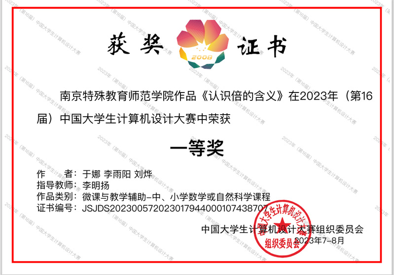 近日,2023年(第16届)中国大学生计算机设计大赛全国决赛传来喜讯,伟德官网学生团队的两个作品在微课与教学辅助/数媒静态设计类比赛中分别荣获国赛一等奖和二等奖。值得一提的是,在比赛颁奖直播现场,一等奖获奖作品《认识倍的含义》作为国赛特色作品获得专家推荐点评,同时该作品的学生主创团队受邀远程在线做答辩演示。