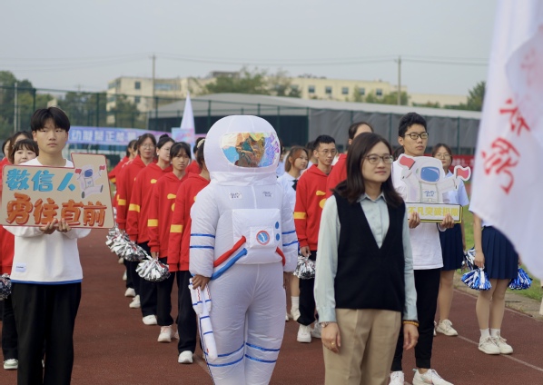 年少正当时,青春必燃梦。在国旗队、彩旗队、鲜花队、裁判员方阵的带领下,数信学院代表队迈着矫健的步伐,精神抖擞地走到主席台前进行体育文化展演,数信学子们朝气蓬勃,神采奕奕,以最饱满的热情迎接本次运动会开幕。