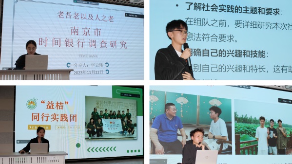 本次宣讲会按照实践主题划分为发展成就观察、创新创业专项、“融爱”大学生支教专项等六个不同的篇章,八个优秀实践团队分别从实践活动与成果展示、个人思想感悟等方面,通过PPT讲解、视频介绍等方式纷纷展示了在暑期社会实践中的丰富经历和收获。发展成就观察篇章中,“老吾老以及人之老”时间银行调查研究团队向大家介绍了新型互助养老模式——“时间银行”的概念,从“青年人帮助老年人”这一概念出发,鼓励大家关注老年人的养老服务;“有爱无碍”调研团谈到他们在实践中注意到无障碍设施的紧缺情况,呼吁全体同学关爱残疾人,为他们出行保驾护航;“益桔”同行实践团聚焦残疾人文创就业创业现状疾人机构运行现状,为燕子矶街道残疾人之家、马群街道残疾人之家提供了项目品牌包装方案。创新创业专项中,远见梦想家暑期社会实践团调研了大学生“创新创业”的现状,鼓励学弟学妹们躬耕实践创新。助力乡村振兴专项中,循梦向阳实践团就助力乡村振兴暑期社会实践进行分析。“垃圾分类 青春助力”专项篇章中,追蓝逐绿团队分享了在社区推广智慧垃圾分类的经历,呼吁同学们在生态文明建设道路上贡献自己的青春力量。红色宣讲篇章中,“两弹一星”精神“星”火相传宣讲团深入社区、学校宣讲红色故事,激励当代青年不忘先烈、铭记历史,做有理想、有担当、有作为的新时代青年。