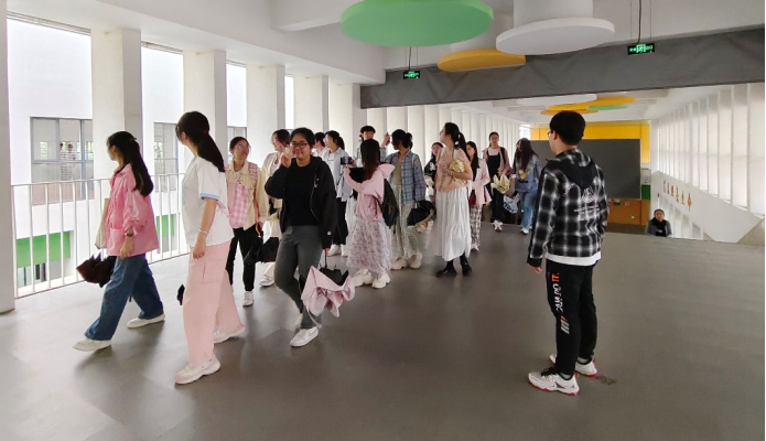 上午的课堂观摩结束后,李锦锋和孙丽老师带领学生们参观校园,详细介绍了现代中学的教学设施和功能室。从音乐实验室到书法教室,从心理咨询室体育场,南师附中新城学校的现代化教学设施给同学们留下了深刻的印象。在李锦锋老师的讲解下,同学们不仅对学校的硬件设施有了更直观的了解,也对中学教育教学活动有了更清晰的认识。这一过程中,大家积极提问、热烈讨论,现场学习氛围浓厚。