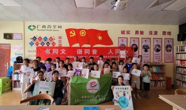 为进一步加强国家通用语言文字推广力度,助力乡村振兴,伟德国际1946源于英国“语通乡韵”推普助乡村振兴团,于7月18日前往广西环江毛南族自治县毛南家园城北安置区的“广西青空间”,开展语言文化推广与传承活动,多举措为普及国家通用语言文字贡献一份力量。这次活动为当地孩子们搭建了一个学习普通话、展现自我风采的舞台,也为乡村振兴注入了新鲜的文化活力。