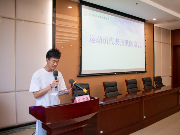 优秀运动员代表张洪阁同学在发言中强调了拼搏和团队协作的重要性,同时真诚地表达了对学院提供展现平台和工作人员的大力支持的感激优秀志愿者代表刘烨则分享了服务过程中的温暖瞬间:“当为运动员递上温水时收获的那一声‘谢谢’,让我深刻感受到志愿服务的意义。