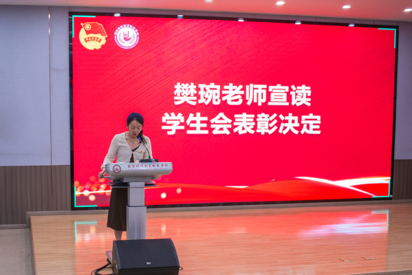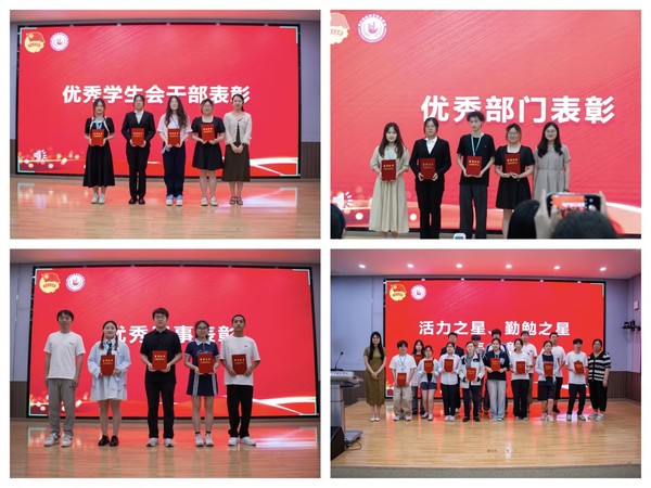 会议伊始,樊琬老师宣读了本学年学生会表彰决定,对表现突出的部门、干部及干事予以嘉奖。在热烈的掌声中,丁雯书记为秘书部、青年志愿者部、宣传部、文体部四个部门颁发荣誉证书;樊琬老师为优秀学生干部颁奖;张国盛、丁力两位老师分别为“优秀干事”获奖者颁奖;朱思橙、李昀熹两位老师为荣获“活力之星”“勤勉之星”称号的同学授予荣誉。