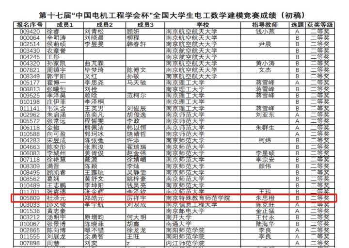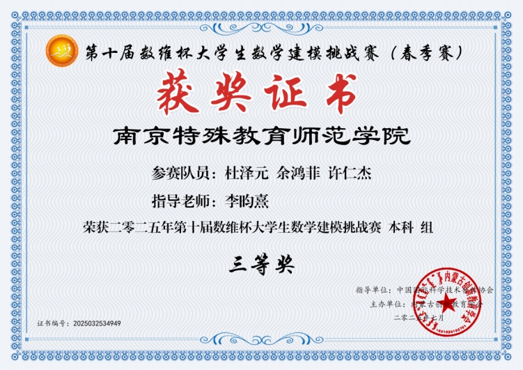 近日,2025年第七届“中青杯”全国大学生数学建模竞赛、第十七届“中国电机工程学会杯”全国大学生电工数学建模竞赛和2025年第十届“数维杯”大学生数学建模挑战赛落下帷幕,伟德官网伟德国际1946源于英国杜泽元、余鸿菲、郑天宇等学子荣获国家级奖项3项,其中一等奖1项、二等奖1项、三等奖1项,实现了伟德官网在“中青杯”全国大学生数学建模竞赛和“中国电机工程学会杯”全国大学生电工数学建模竞赛两项赛事上获奖零的突破。