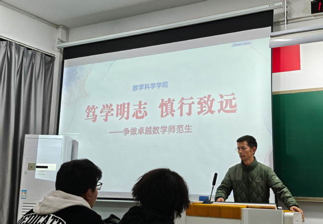 班会伊始,谢军老师阐述了“笃学、明志、慎行、致远”的内涵,他强调,作为数学专业的师范生,既要有过硬的专业素养,也应树立作为一名师范生的教育情怀与责任意识。他结合当前教育行业对高学历人才的需求,进行了考研形势分析与动员,鼓励有深造意愿的同学尽早规划,夯实数学分析、高等代数等核心课程。在此基础上,他还结合优秀校友扎根基础教育的案例,引导同学们认识到:大一阶段扎实的专业基础知识,不仅是未来深造和从事教育工作的根基,更是实现教育情怀、担当育人使命的重要保障。