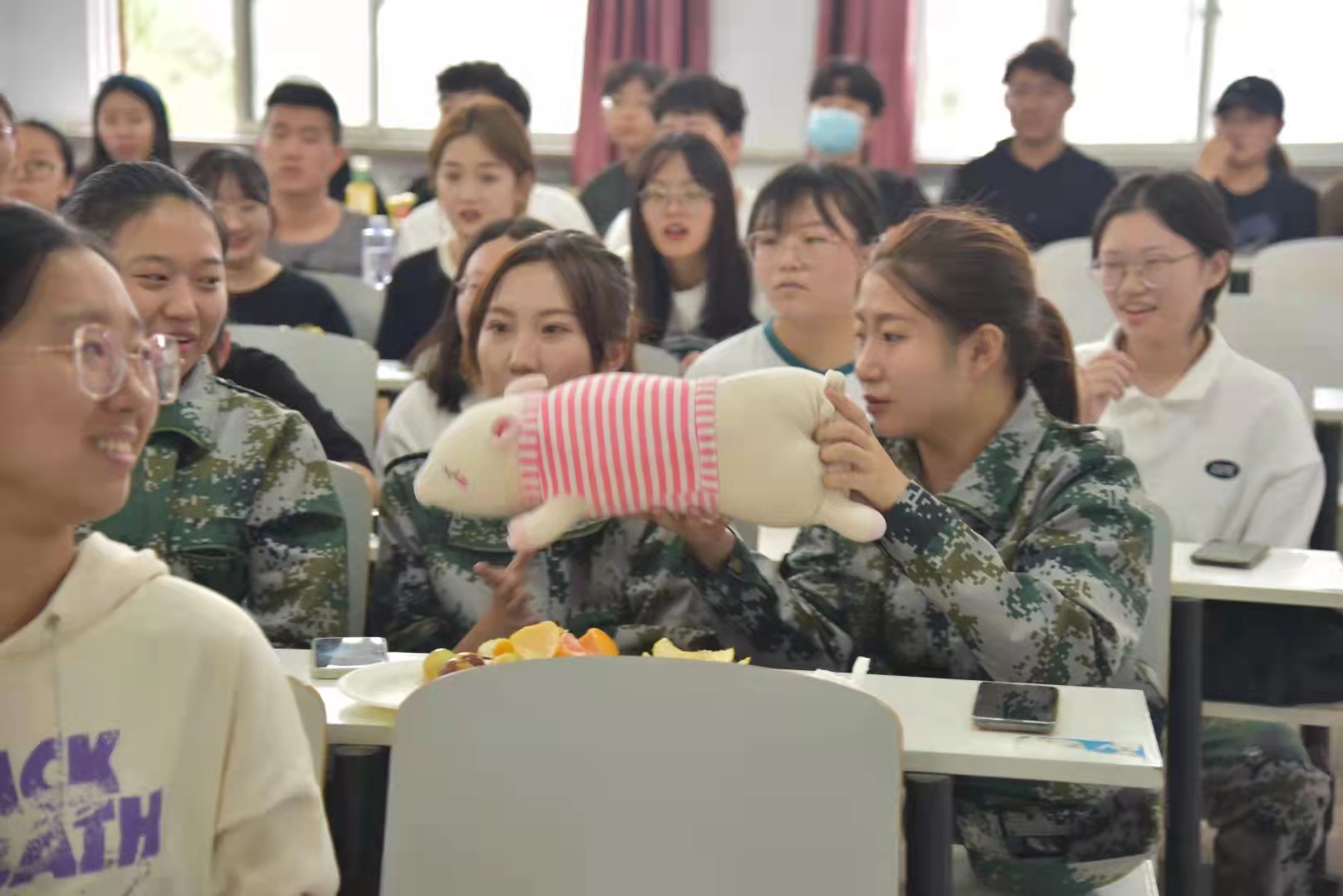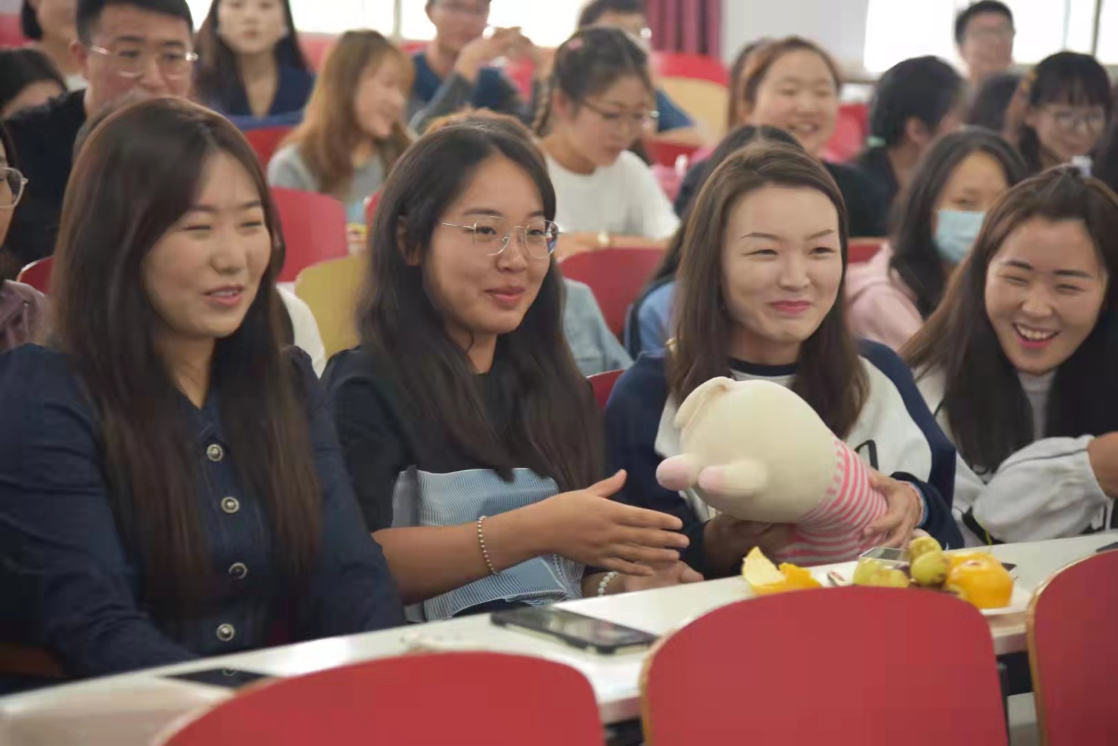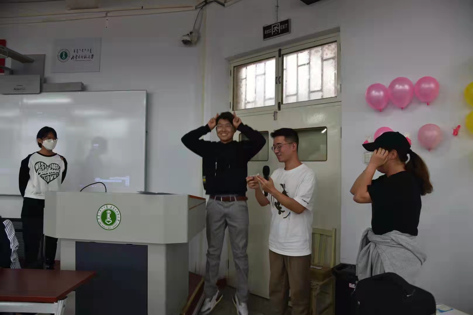 随后,刘榆萍同学主持师生互动环节。大家一起玩游戏,击鼓传花、扎气球等,教室里充满了大家的欢声笑语和浓浓的节日的氛围。