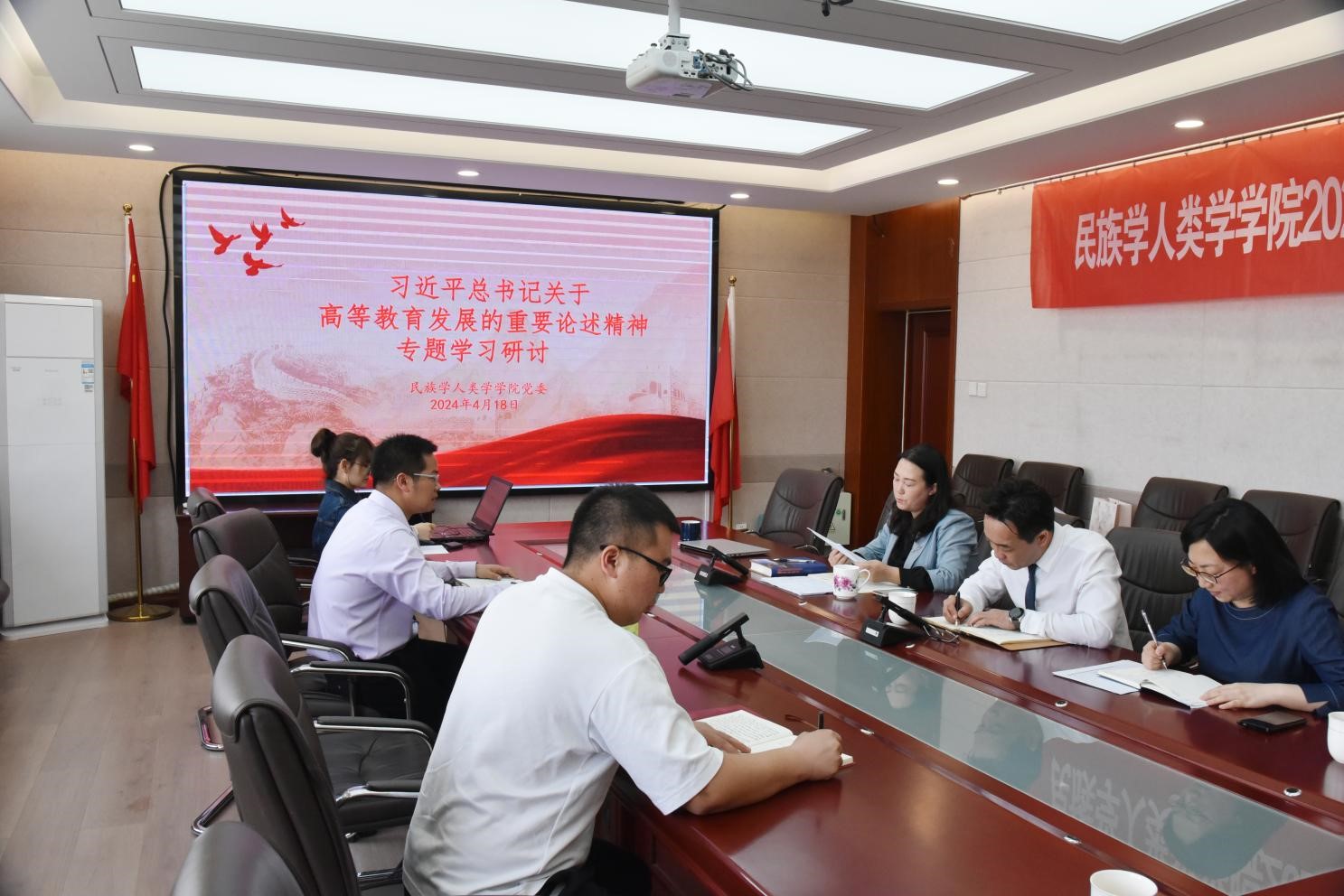 根据校党委宣传部《关于组织开展好习近平总书记关于高等教育发展的重要论述、习近平总书记在二十届中央政治局第五次集体学习时的重要讲话精神学习研讨的通知》,民人院党委于2024年4月18日下午4点在田楼607开展集中学习研讨活动,会议由学院党委书记包凤兰主持,党委副书记副院长陆一琼、副院长满达、副院长韦兰海及其他中心组成员共同参加会议。