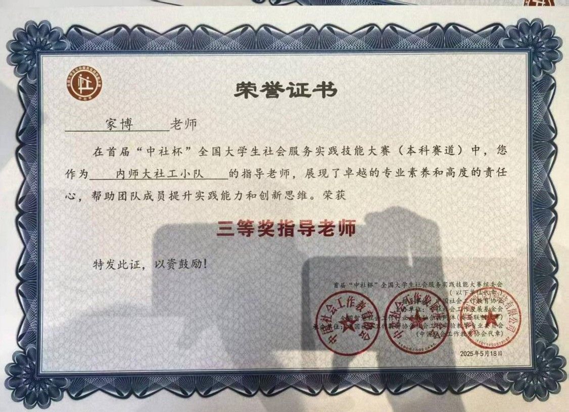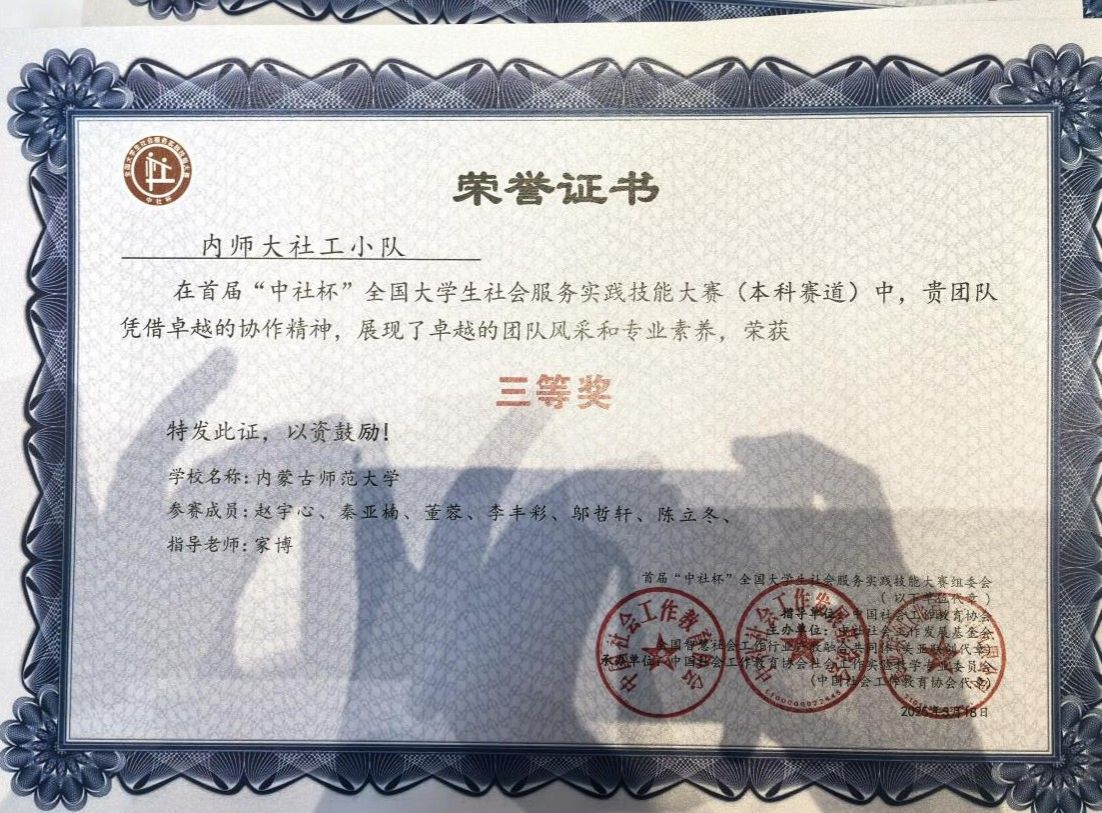 “中社杯”大赛由中国社会工作教育协会、中社社会工作发展基金会联合主办,是国内社会工作领域规模最大、规格最高的大学生实践技能赛事。本届大赛吸引了来自复旦大学、江南大学等全国三分之二的社会工作院校参与;大赛采用初赛、复赛、全国总决赛三级赛制,经过长达一年的层层选拔,最终仅有10%的队伍晋级全国总决赛。我校代表队凭借扎实的专业基础和出色的临场发挥,荣获全国三等奖。