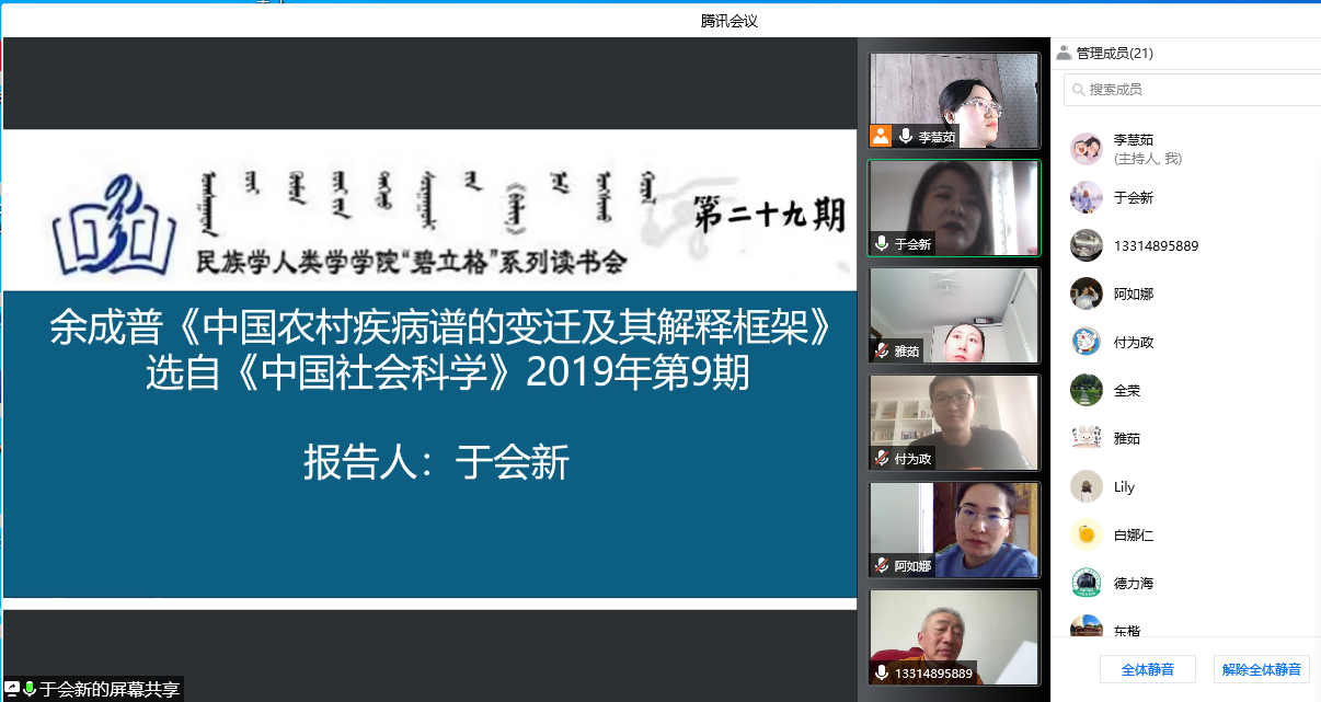 2020级民族学博士生于会新同学精读的论文是《中国农村疾病谱的变迁及其解释框架》,选自《中国社会科学》2019年第9期。于会新同学介绍了医学人类学(也称健康人类学)的学科背景、视角和理论框架,进而结合本篇论文具体分析其写作结构、研究方法、政策启示等,让在座同学均感受到交叉学科的魅力,同时拓展自己研究思路、引发论文写作的思考,可谓精彩至极。