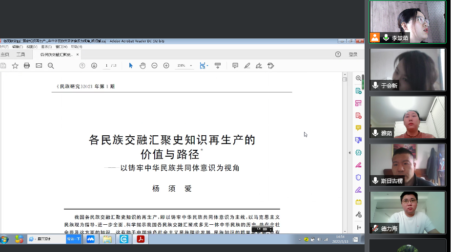 2020级民族学博士生斯日古楞同学精读的论文是《各民族交融汇聚史知识再生产的价值与路径——以铸牢中华民族共同体意识为视角》,选自《民族研究》2021年第1期。斯日古楞同学从论文“各民族交融汇聚史知识再生产”理论出发,结合自己假期田野调查的经历,为同学们分享了田野调查搜集资料的方式方法,极具借鉴意义。
