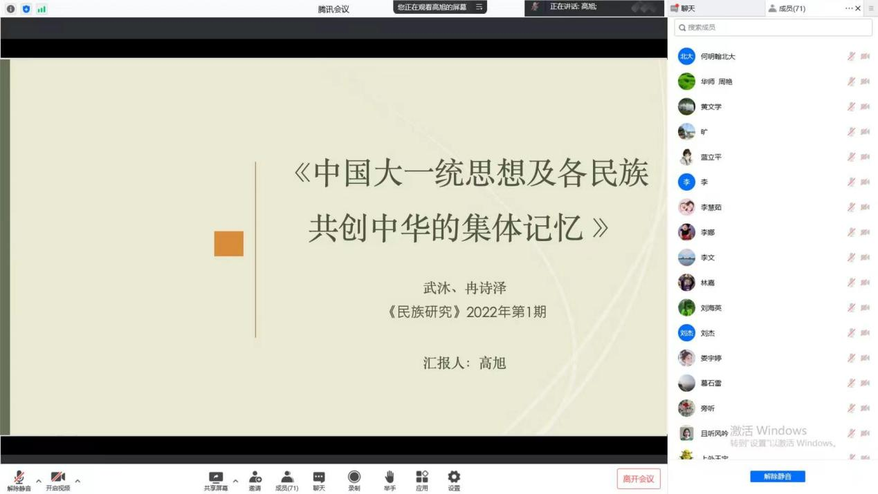 高旭同学分享的论文是《中国大一统思想及各民族共创中华的集体忆》,发表于《民族研究》2022年第1期。分享者首先介绍了论文作者、发表期刊等基本概况,其次重点介绍了该文章的主要内容,研究意义等。文章主要包括七个部分,主要论述了在大一统思想发展的不同阶段,我国少数民族做出的重要贡献。从魏晋南北朝到辽朝,少数民族在大一统的“共祖异族”理论框架下,以炎黄血脉认同为共识,创建了一个个局部统一的多民族政权;在金、元、清三朝,少数民族则在“我本中国”的理论框架下,以国家认同为共识,建立了统一(或局部统一)的多民族国家。这其中,以北魏为代表的北方少数民族在魏晋南北朝时期创造性地践行了“脱夷统华”理论;在后唐、后晋、后汉三朝,沙陀人凭借“政治正统”完成正统建构;契丹人更是在“脱夷统华”理论中增添了“北极之下为中国”的内容,扩大了“中国”的内涵。金朝建立后,多民族的中国观被创建出来,中国大一统思想开始进入“我本中国”的理论进程。元、清两朝都是这一理论的成功实践者。这些思想的积极影响,最终铸成了各民族共创中华的共识。