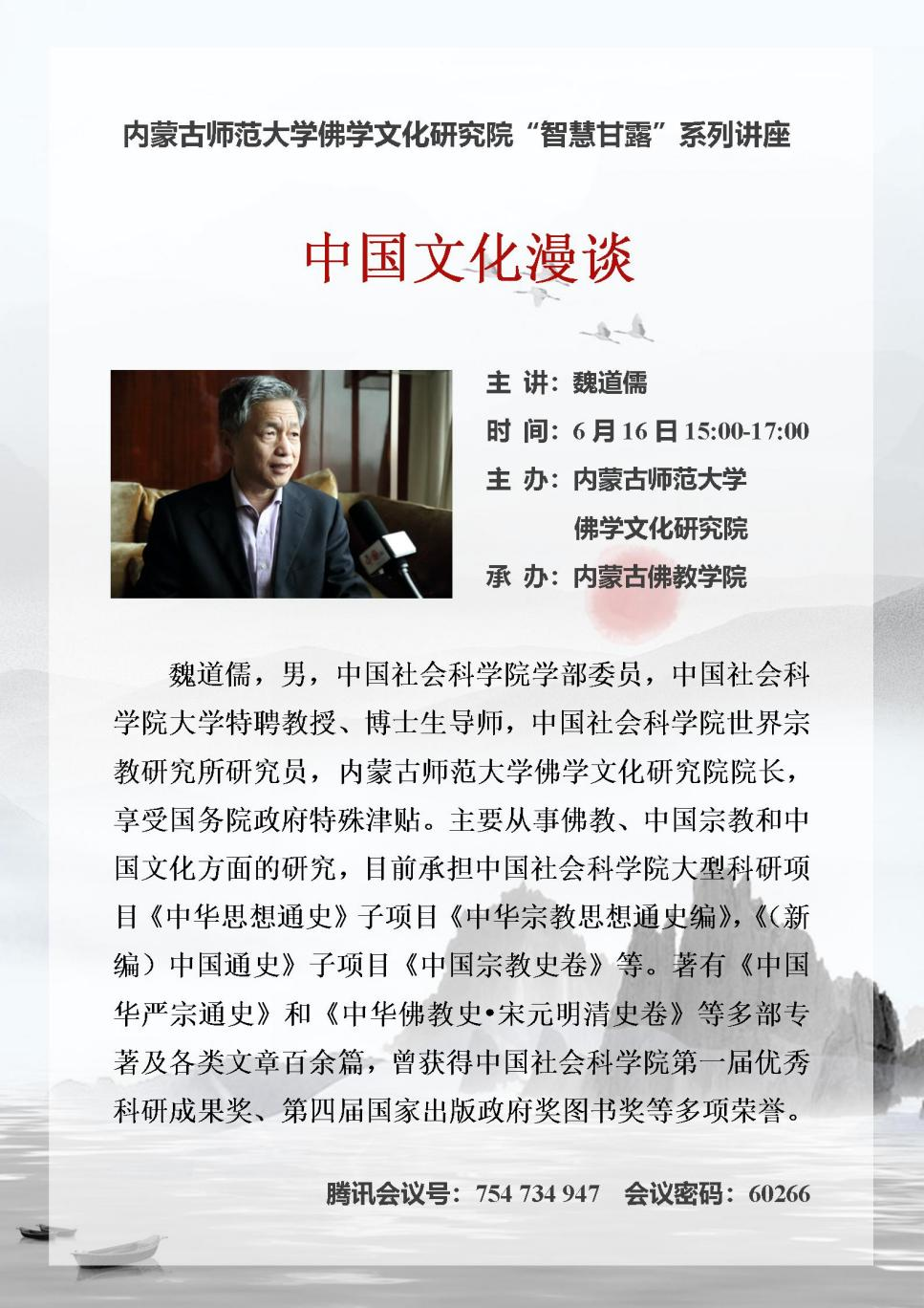 6月16日下午,中国社会科学院学部委员、我校佛学文化研究院院长魏道儒先生应邀做客“智慧甘露”系列讲坛,在线上为今年会官网师生做了题为“中国文化漫谈”学术讲座。讲座由副院长满达主持,宗教学专业全体师生及内蒙古佛教学院院长布仁满都拉等全体师生聆听了讲座。