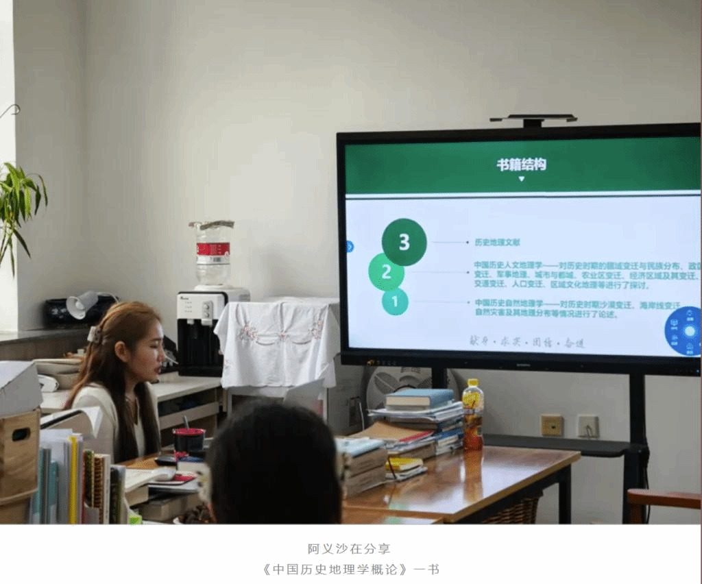 首先,阿义沙分享的是西北民族大学历史文化学院教授、四川大学历史学博士生导师朱悦梅的著作《中国历史地理学概论》一书。此书全面深入地论述了中国历史地理相关领域的知识。在历史自然地理学方面,涵盖了气候变迁及其对人类社会的影响,植被的演化,江河湖沼(如黄河改道、长江水系变化等)的演变过程,沙漠的变迁趋势以及海岸线的动态变化。同时也对自然灾害的类型、频率、分布和周期规律展开研究。在历史人文地理学领域,包括从历代疆域的演变到各民族分布,从郡县制到行省制等行政建制的沿革,长城等军事防御设施和古战场相关的军事地理,城市与都城在选址、建设和变迁中与政治、经济、文化的关联,农业生产与环境、经济的关系,商业、手工业分布变化和经济重心转移,域内和域外交通的发展变迁,不同历史时期的人口数量、分布与迁徙等情况。此外还涉及区域文化地理中文化区的形成和演变及其与地理环境的相互关系。最后对历史地理相关的传世文献和考古资料等重要文献资料进行了介绍。阿义沙同学对这本书进行了全方位解读,运用 PPT 图文并茂地向大家展示,让我们深刻体会到了历史地理学的独特魅力。它打破了我们以往对历史和地理的简单认知,明白了二者的密切关联。领会到了历史不再是孤立的人物和事件,地理也不再是简单的山川河流,它们是相互影响、相互塑造的。